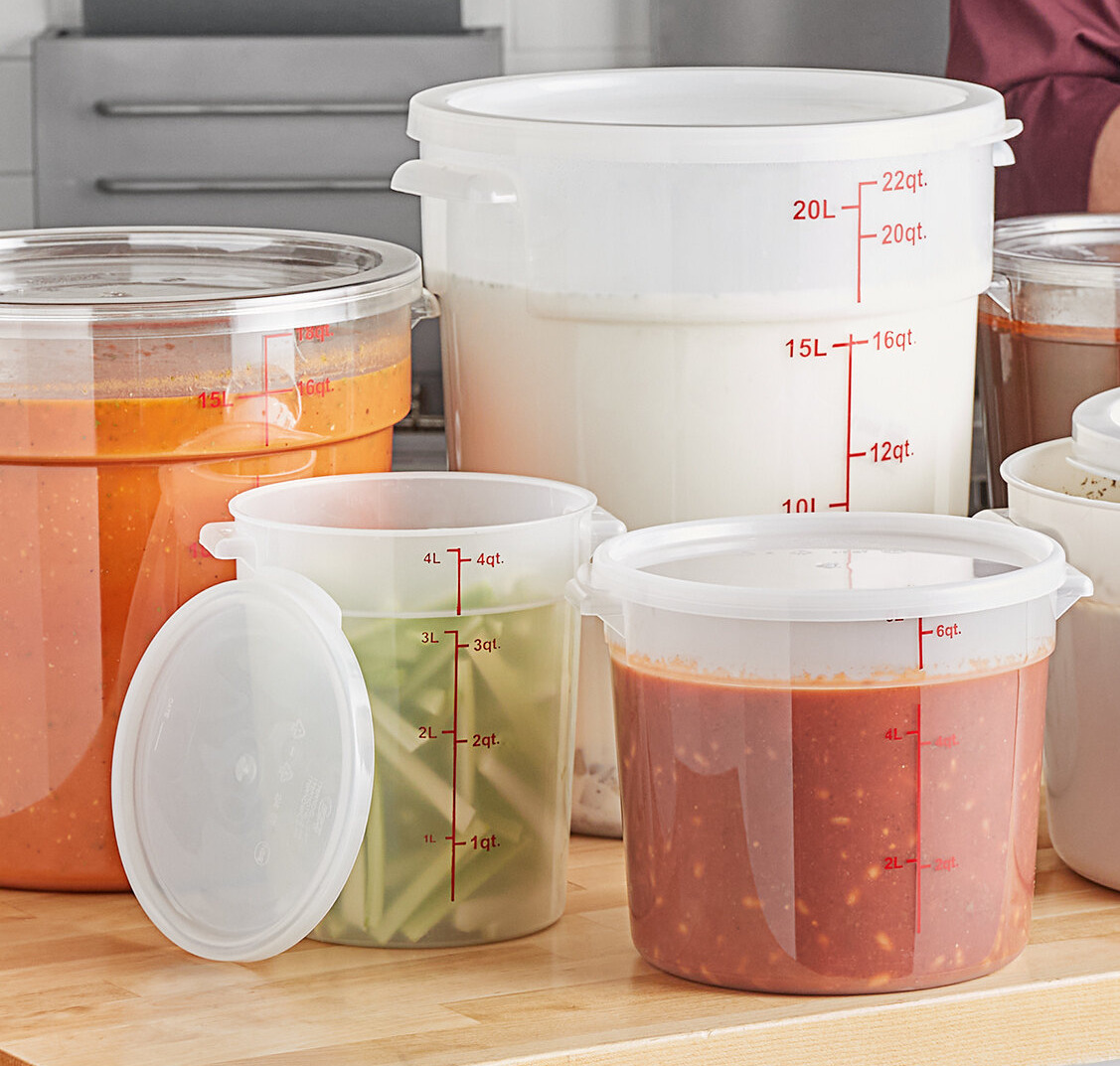 The flexible polypropylene design gives this lid and container the strength and affordability you need in your commercial kitchen, making them perfect for restaurants, caterers, delis, and cafes. Use them to store freshly-chopped fruit salad, sliced vegetables, soup stock, or stew. This container and lid are perfect for any ingredient or prepped food because they are durable and resistant to stains.