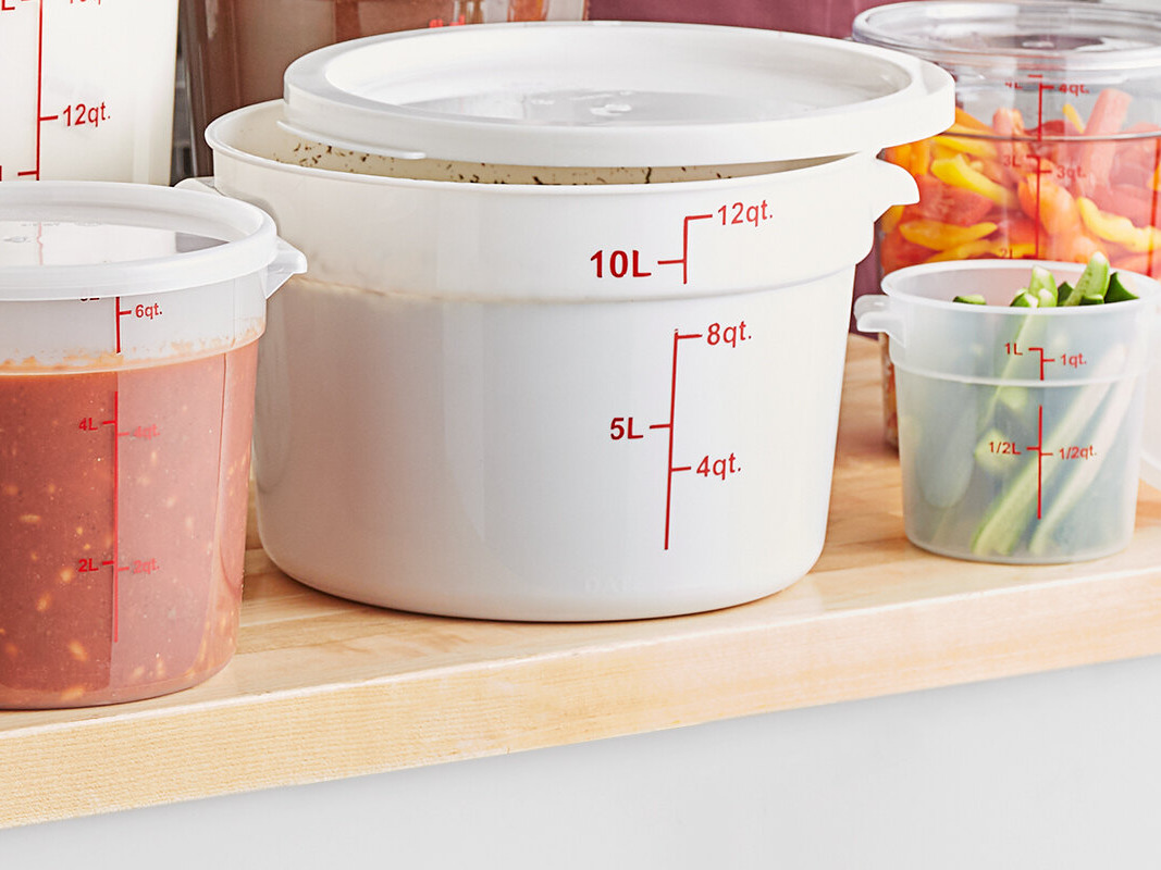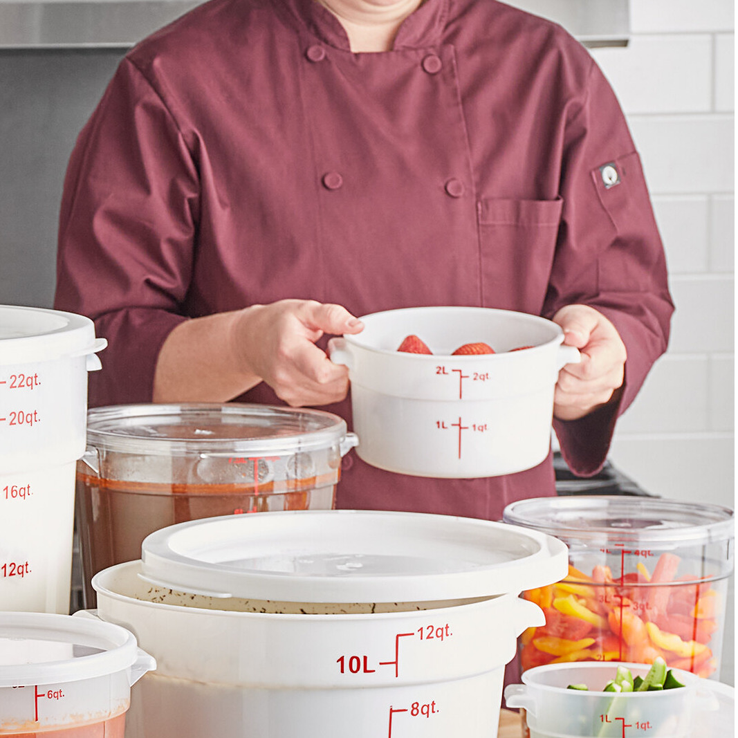 Whether storing dry goods or prepped ingredients, this container is versatile and can handle temperatures ranging from -40 to 160 degrees Fahrenheit, making it ideal for a wide range of kitchen tasks. This Choice white round polypropylene food storage container with lid is perfect for restaurants, catering establishments, delis, and cafes that want to enhance their service and streamline their prep organization!