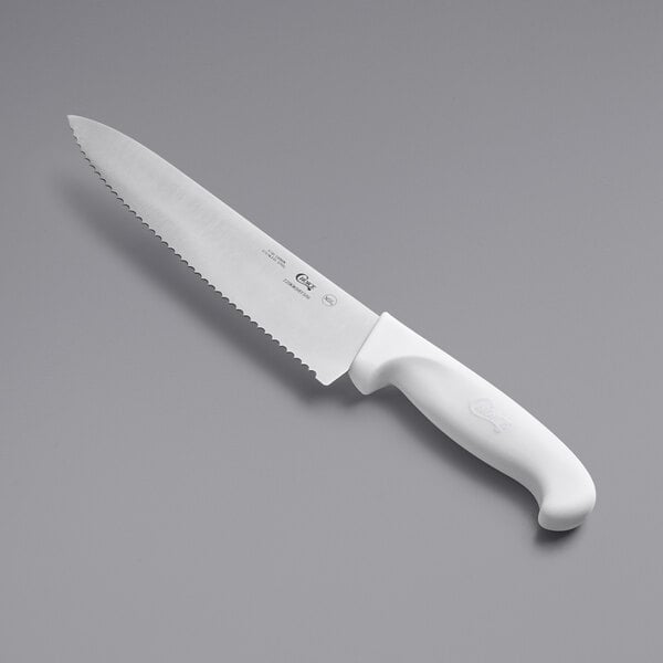 The stainless steel serrated blade edge allows for the knife to easily tear through the tough skins and exteriors of a variety of foods without damaging soft insides. Crafted with high carbon stainless steel, this dependable knife offers the high rust- and stain-resistance your business requires.