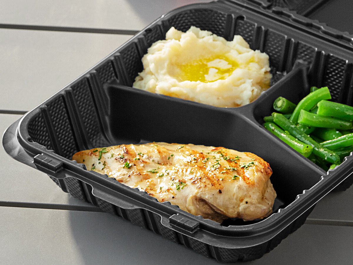 This clamshell container is ideal for a wide range of to-go applications and is microwave-safe, allowing your guests to reheat their food after they arrive home. It's suitable for holding both hot and cold food items, so you can use it to send pasta, salads, french fries, sandwiches, or other tasty treats home with your customers. With a temperature range of 0 to 275 degrees Fahrenheit, it accommodates a variety of dishes without compromising its integrity. Plus, it features 3 compartments to keep sides and entrees from touching during transportation and storage.