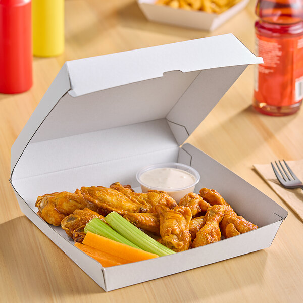 It's great for taking different types of hot and cold foods to go, including salads, sandwiches, burgers, and fries. This white container is a must-have for any restaurant, cafe, or concession stand that offers to-go options!