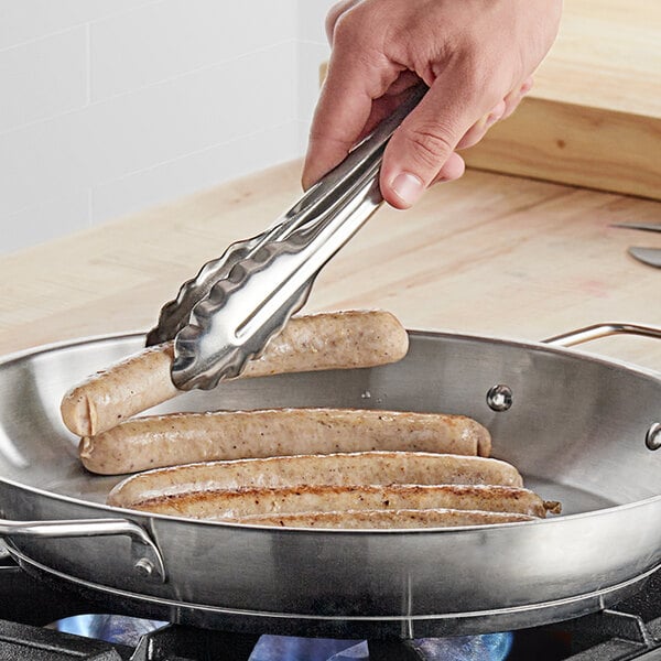 Satisfy your front- and back-of-house cooking and food-handling needs with these utility tongs! Made of 18 gauge stainless steel, these Choice 9 1/2" extra heavy-duty stainless steel utility tongs are the perfect choice for efficiently handling and serving food in a fast-paced environment. Experience incredible ease of use while serving and cooking meats, salads, and side dishes thanks to these Choice tongs. Featuring a concave utility end, these tongs include a scalloped-edge design that grips food firmly and gently. The two-piece stainless steel construction allows for quick and easy cleaning and presents a sleek, professional appearance that complements both front- and back-of-house settings.