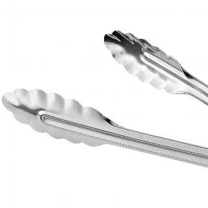 Made of 24 gauge stainless steel, these tongs are made to last. Featuring scalloped edges, these tongs guarantee a firm grip, allowing slippery items such as buttered corn or fruit to be grabbed safely.