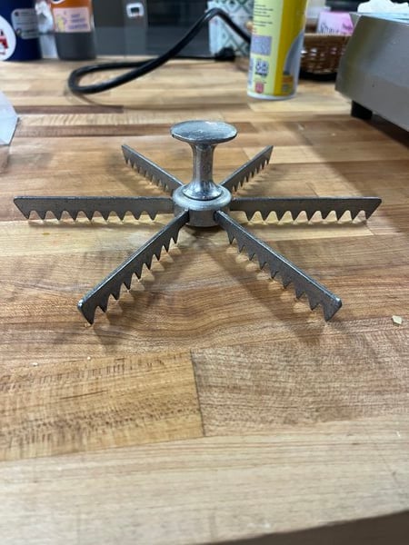 It features rust-resistant aluminum blades for a pie marker you can depend on. It makes perforated marks for perfectly-spaced pieces. Plus, it's easy to clean with its removable knob, and it features 10 arms with 9 teeth each. This convenient tool is perfect for your restaurant, cafe, or bakery!