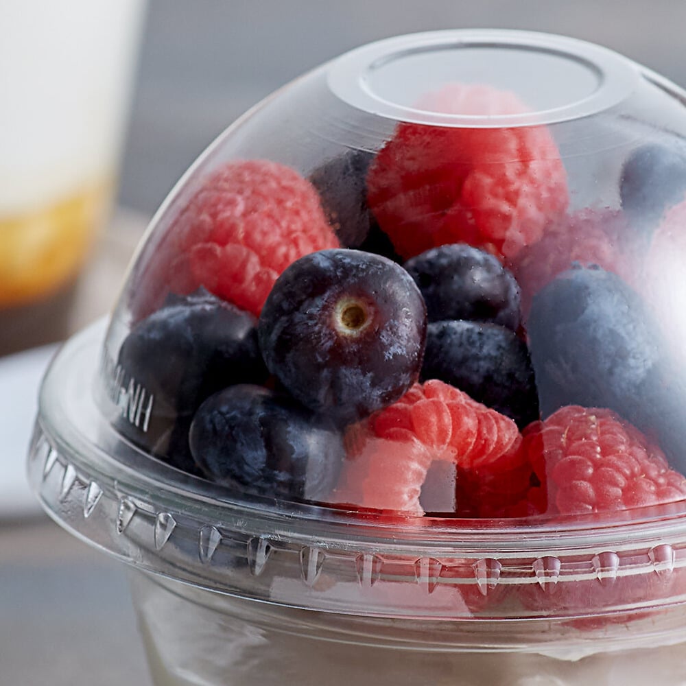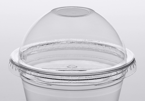 This dome lid creates a tight seal when used with the compatible cups, keeping contents fresh. This, combined with its no hole design, prevents spills and leaks. It is also made of recycled PET material making it an environmentally friendly choice, and its dome shape creates a greater capacity for contents.