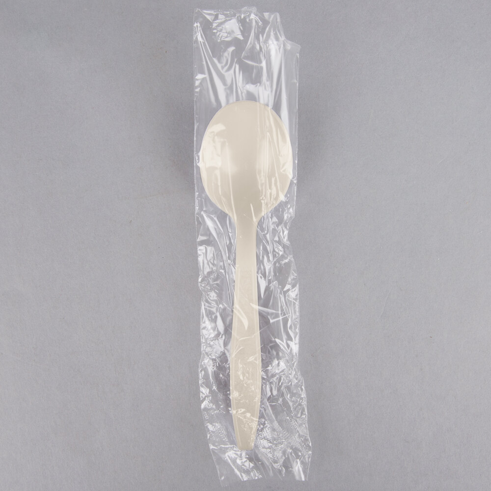 This Choice beige heavy weight wrapped polystyrene plastic soup spoon is perfect for your take-out restaurant, cookout, party, gathering, or other catering event.