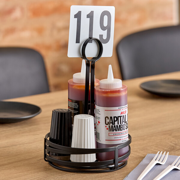 Customers appreciate these black condiment caddies for their solid construction, durability, and stylish matte finish. They enhance table aesthetics and are versatile enough to hold a variety of condiment containers. The strong coil ensures items are securely held, making these caddies a practical and attractive addition to any table setting.