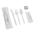 This Choice heavy weight polypropylene cutlery pack gives your customers everything they need for their meal in one convenient package. This plastic cutlery pack comes complete with a fork, a spoon, and a knife, making it perfectly suited for take-out orders, food trucks, concession stands, and catered events. In addition to the cutlery provided in this pack, a dinner napkin, salt packet, and pepper packet are also included for guests to use throughout their meal. Wrapped in a clear poly wrapper, each set is protected from contamination and debris, keeping it sanitary during storage. You can provide these cutlery packs to your customers in to-go boxes and take-out bags or fill your flatware bins with them for guests to grab at your quick-serve restaurant.