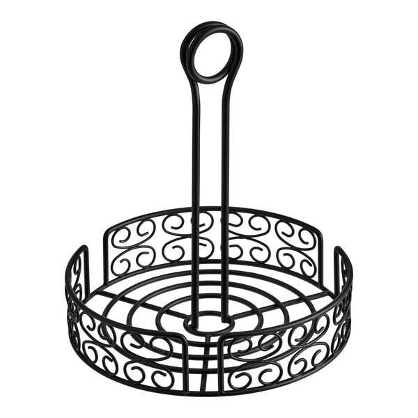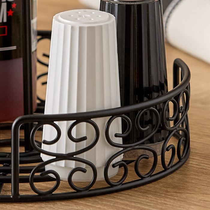 This Choice 8" x 9 1/2" black round mediterranean wrought iron condiment caddy is perfect for holding salt and pepper shakers, as well as bottles of salad dressing, ketchup, and mustard. Use it to store your signature barbecue sauce or seasoning blends on your dining tables for easy access by your customers. With this wrought iron caddy, you'll be able to stay organized in style.