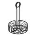 This Choice 8" x 9 1/2" black round mediterranean wrought iron condiment caddy is perfect for holding salt and pepper shakers, as well as bottles of salad dressing, ketchup, and mustard. Use it to store your signature barbecue sauce or seasoning blends on your dining tables for easy access by your customers. With this wrought iron caddy, you'll be able to stay organized in style.