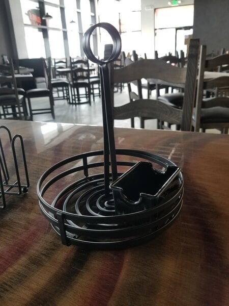 This choice brand wrought iron round birds nest style condiment caddy is fantastic I like how it has the bar in the middle so I can put a table number it was very inexpensive