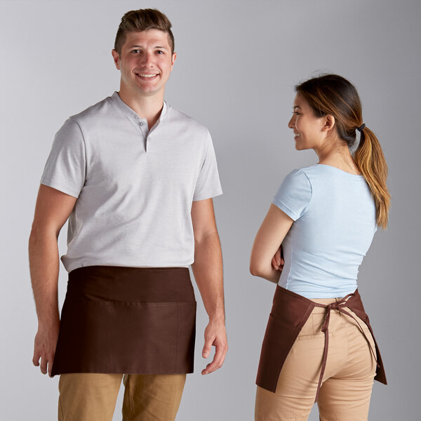 This waist apron is perfect for keeping your bar, bakery, school, hospital, or nursing home staff clean and comfortable during their shift. The rich brown color pairs with a shorter length design and durable poly-cotton twill material for a functional fit that's built to last.