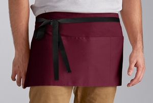 This waist apron is perfect for keeping your bartender, bakery, school, hospital, or nursing home staff clean and comfortable during their shift. It features a durable fabric, convenient pockets, and a contemporary black and burgundy color. Your bar and wait staff will look sleek and professional in this Choice apron.
