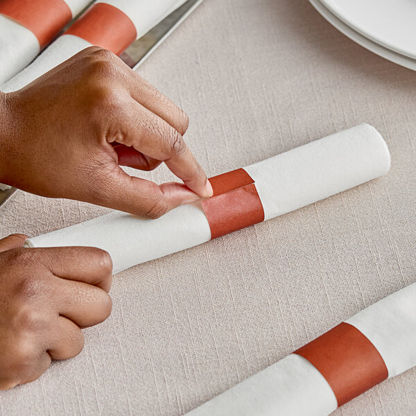 Featuring a warm, reddish-brown cinnamon color, these napkin bands are an understated addition to your dining area. Perfect for holding rolled napkins and flatware securely in place, these bands are a must-have for restaurants, cafes, and catered events. Ensure a seamless dining experience with these stylish and practical napkin bands!
