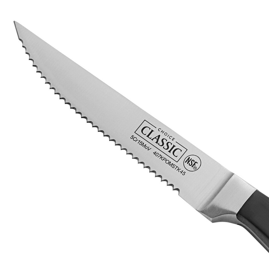 Boasting a durable, fade-resistant, and colorfast polyoxymethylene (POM) handle, this knife is perfect for long-term, sustained daily use in any high-volume establishment, including restaurants, culinary schools, and commercial kitchens. It's perfect for cutting through filet mignon, pork chops, and even tough cuts of meat. Versatile, affordable, and high quality, this Choice Classic steak knife is the ideal tool for making effortless and efficient precision cuts.