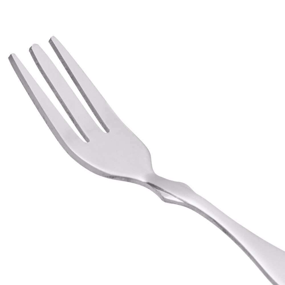 Complete your table setting with this Choice Delmont 6" cocktail fork. Pair it with the rest of the Delmont line to create a casual yet classic look that will compliment standard fare and comfort food. Your guests are sure to appreciate the sturdy construction of this flatware, and it won't break your budget! Made of stainless steel, it will be a long lasting and attractive addition to your busy dining area. It is great for completing table settings at family restaurants, bar and grills, and cafes.