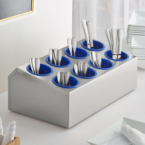 This holder is perfect for back-of-the-house use in restaurants, bars, cafes, and coffee shops. Alternatively, it works well at your buffet line or at other self-service stations. This holder keeps your flatware handy and works to give your patrons the impression of cleanliness and quality. It features eight openings for flatware cylinders so you have plenty of room for your selection.