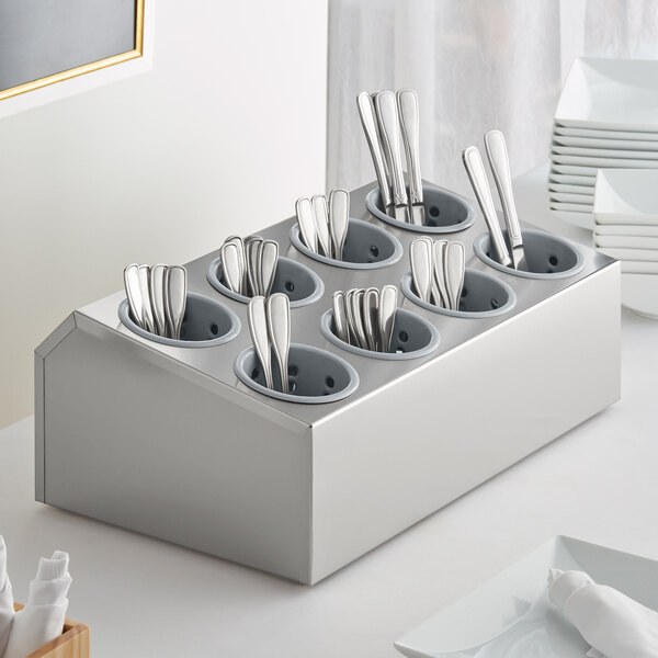 - Item #: 176fltwrgyt8Choice Eight Hole Stainless Steel Flatware Organizer with Gray Perforated Plastic Cylinders