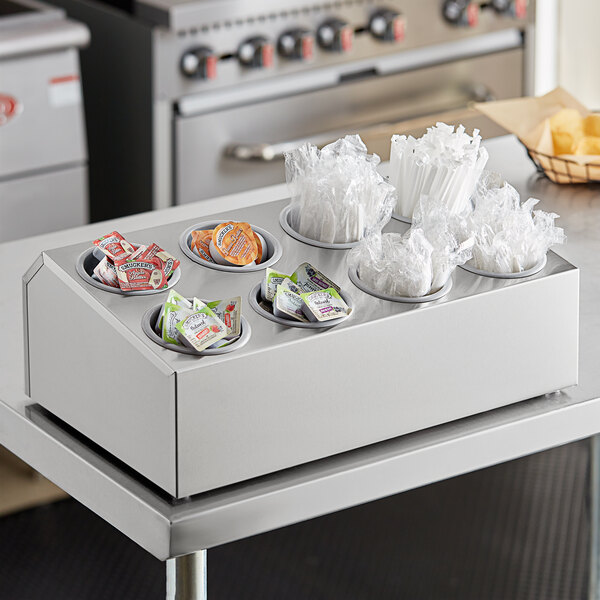 Its durable stainless steel design guarantees longevity, while ensuring an easy-to-clean surface. Plus, its sturdy, compact construction saves valuable countertop space while rolled edges provide additional durability and safety. Non-skid feet keep the organizer securely in place on your counter during use for convenience. Add this complete organizer kit to your food truck, restaurant, drive-thru, or catered event to organize and store your essentials.