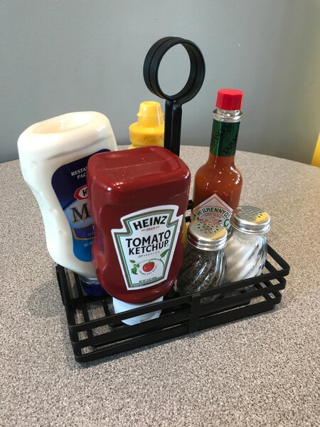 These condiment caddies were a great addition to our tables to give the restaurant a more upscale look. Our fit ketchup, mustard, salt, pepper and sugars.