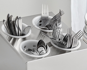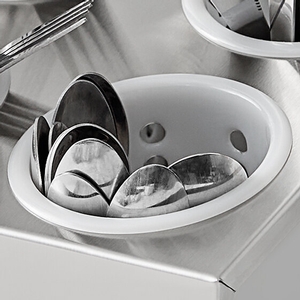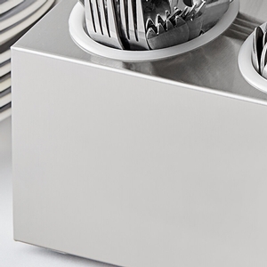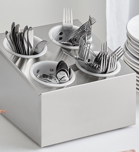 This holder is perfect for your buffet line or other self-service stations. Alternatively, it works well on your buffet line or at other self-service stations. Great for high-volume operations, the holder offers a bulk flatware storage solution that makes it easy to access for you and your guests and allows for proper drainage after leaving the dish station to eliminate water spots and tarnishing.