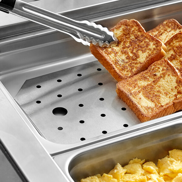 When you use a false bottom in your steam table pan it makes the food in the pan more visible and easier to reach, while the included drain holes ensure the liquids and sauces drain properly to prevent foods from being soggy or over-saturated.