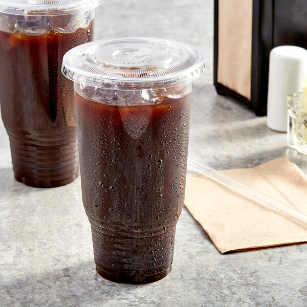 Made of recyclable plastic material, this cup is durable and crack-resistant, therefore reducing customer complaints due to cracked sidewalls. Economical, functional, durable, and visually appealing, this 32 oz. plastic cup with flat lid is the perfect disposable drinkware for your venue.