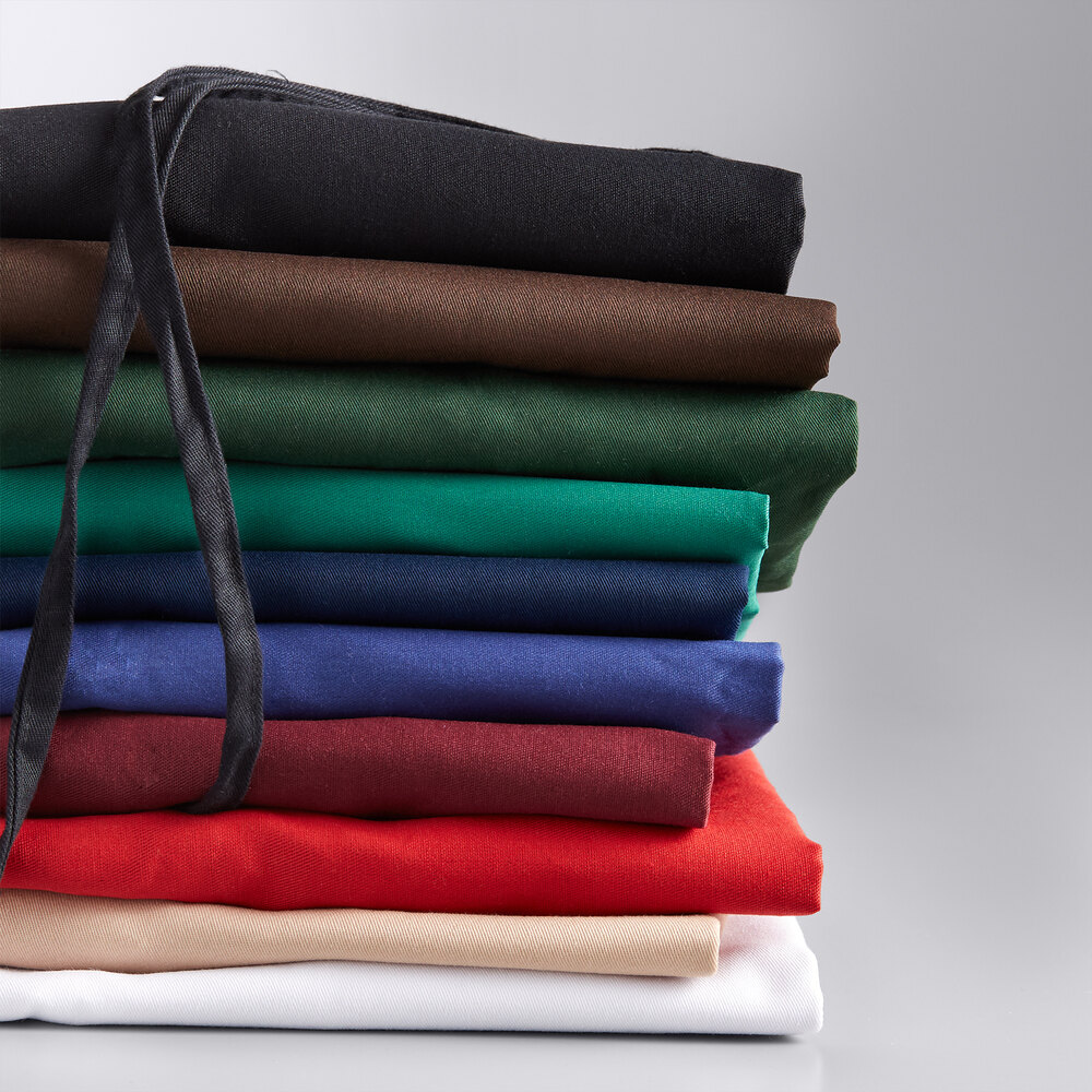 This apron is made of a strong poly-cotton blend, making it durable enough to withstand daily wear and tear. This construction even protects against pilling and shrinkage to maintain your staff's professional, uniform look. Plus, compared to traditional cotton apparel, the apron's color remains fade resistant regardless of how often you wash it.