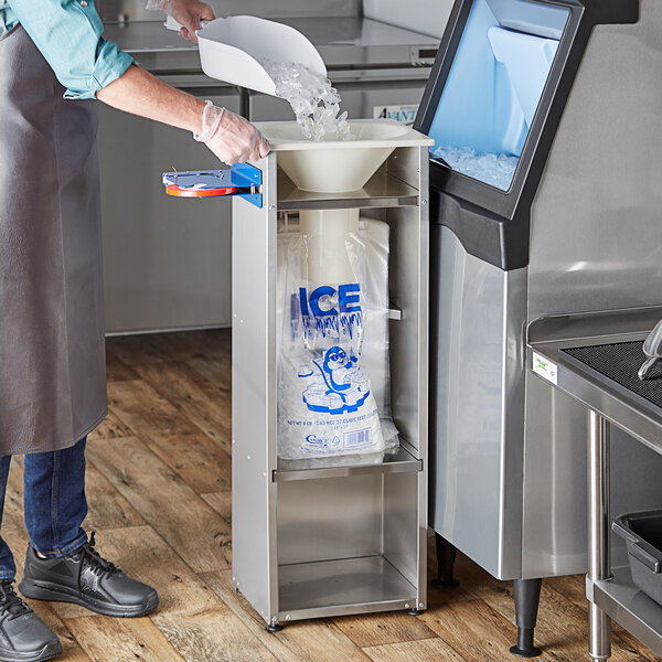 This ice bagger features a shelf to accommodate 8 lb. and 10 lb. bags, and it removes to handle 20 lb. bags, allowing you to fill and sell all of the most popular bag sizes with one single unit. With an 18 gauge type 304 stainless steel body, this unit is easy to clean and durable enough to withstand daily use in your commercial environment.