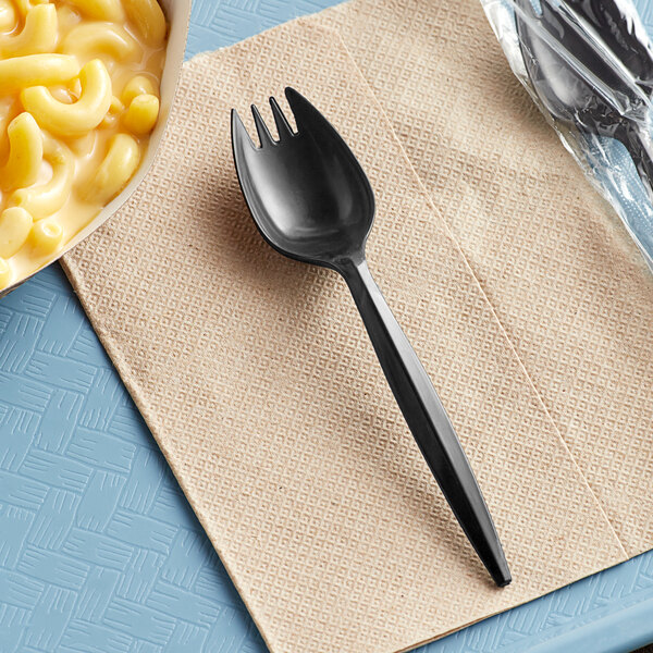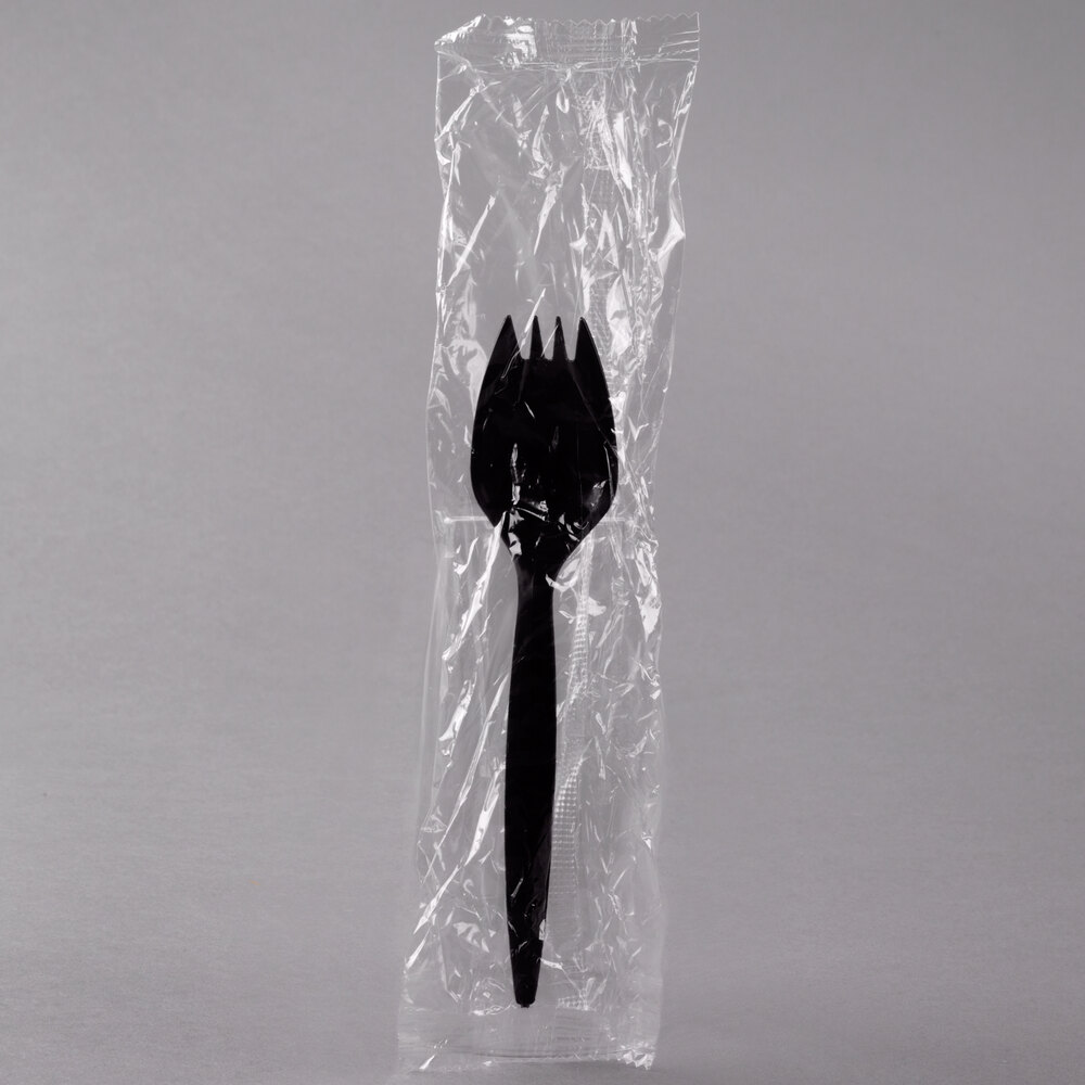 Perfect for take-out restaurants, stadiums, outdoor barbecues, and more, these Choice sporks will exceed your serving needs! Use them for breakfast, lunch, dinner, or desserts to conveniently eliminate any warewashing needs and free up your staff to handle other important tasks. For an economical and practical cutlery solution, stock up on these Choice individually wrapped disposable black polypropylene plastic sporks!