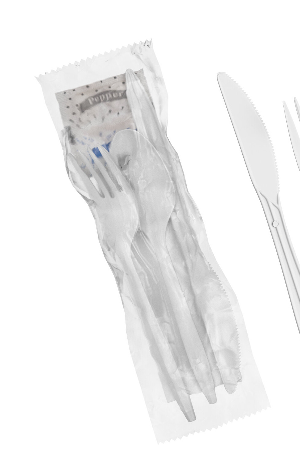 Wrapped in a clear poly wrapper and boasting a classic white color, this medium weight, polypropylene plastic cutlery set with a napkin and salt and pepper packets is just what your establishment needs. Not only does it increase the speed of service, but it also will satisfy your customers by keeping the utensils clean and sanitary!
