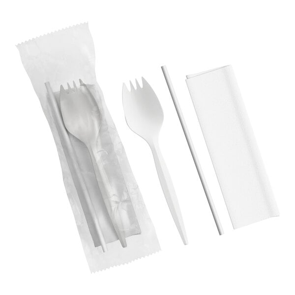 This set includes a spork, straw, and napkin so you can provide your guests with everything they need to enjoy their meal! Great for quick grab-and-go applications, this wrapped kit is a cleaner alternative to unwrapped polypropylene plasticware. Plus, since it's all disposable, you won't have to worry about collecting and cleaning silverware at the end of meal service.