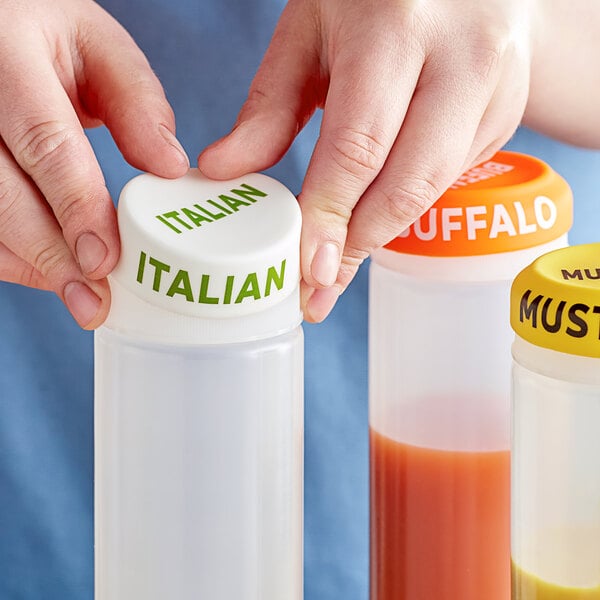 "Italian" is clearly printed to communicate to your kitchen staff what condiment or ingredient is inside. By adding these convenient identification labels to your workflow, you'll save time searching for the right ingredients, reduce errors, and keep customers happy!