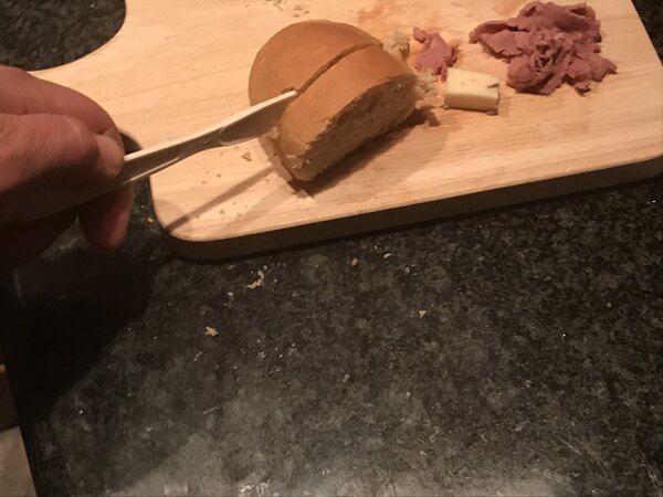 These heavyweight plastic knoves cut through food very easily. They are sharp enough to cut through meat without breaking yet you don't need to worry about cutting yourself picking it up.