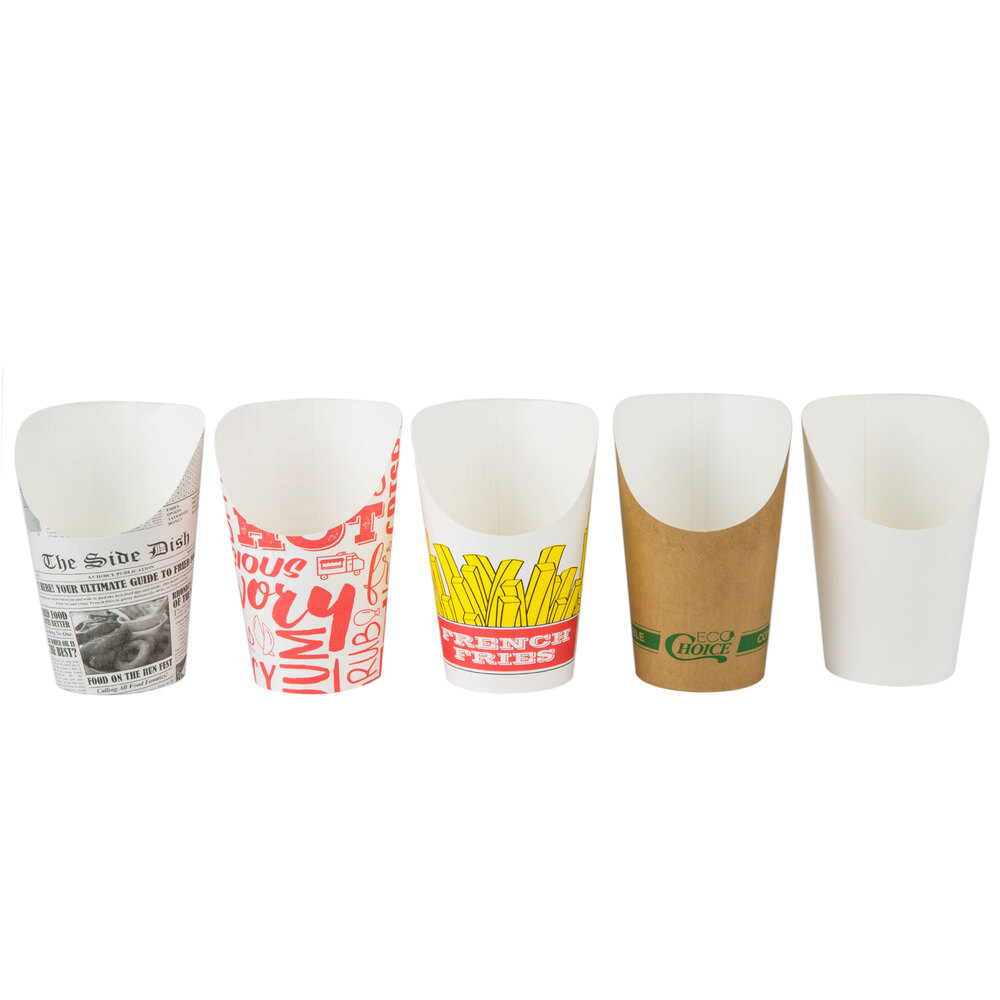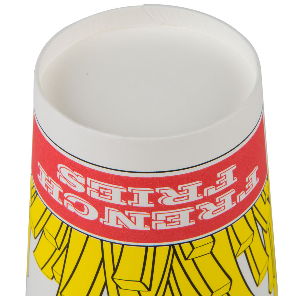 This Choice 12 oz. paper scoop cup with fry design is perfect for carnivals, concession stands, fast food establishments, and snack bars. The round shape and broad opening make it easy to carry and to scoop, ensuring ease of use by staff and patrons, alike. At the same time, the vibrant pattern increases visual interest while the disposable design ensures quick, no-hassle cleanup.