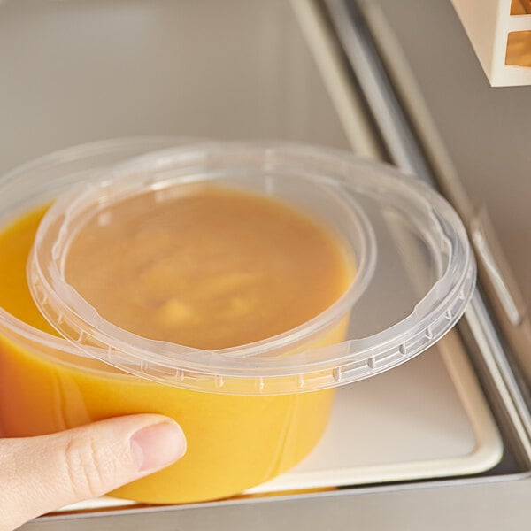 The perfect companion to any translucent Choice microwavable deli container, this lid elevates your take-out capabilities by keeping soups, sauces, and other side dishes securely stored during transport. It locks in the freshness and flavor of your signature dishes, allowing customers to easily enjoy their meals either at home or on-the-go! Your customers will appreciate being served a sturdy lid that won't leak and will keep their leftovers or deli purchases secure during the ride home. When paired with a compatible deli container (sold separately), this lid is leak- and spill-proof. Plus, the lid's recessed fit makes it easy to stack both the lids and containers for convenient, space-saving storage.