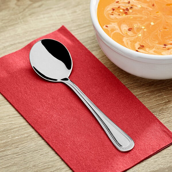 This bouillon spoon features a beaded edge and a subtle design that doesn't feel out of place in a casual dining atmosphere. Its polished finish offers a clean appearance, and it is very much at home in your family restaurant, bar and grill, or cafe.