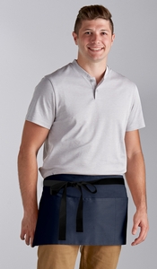 This waist apron is perfect for keeping your bartender, bakery, school, hospital, or nursing home staff clean and comfortable during their shift. It features a durable fabric, convenient pockets, and a contemporary black and navy blue color. Your bar and wait staff will look sleek and professional in this Choice apron.