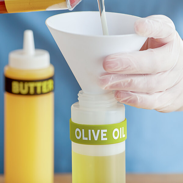 This label band fits 8 and 12 oz. standard and wide mouth bottles and has "Olive Oil" clearly printed to communicate to your kitchen staff what condiment or ingredient is inside. By adding these convenient identification labels to your workflow, you'll save time searching for the right ingredients, reduce errors, and keep customers happy!