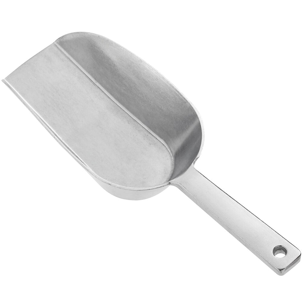 This 6 oz. aluminum scoop features a flat bottom design to easily access the bottoms and corners of containers. The flat bottom also allows the scoop to sit flat on countertops and stack nicely while not in use, or the convenient hanging hole on the handle provides easy, out-of-the-way storage