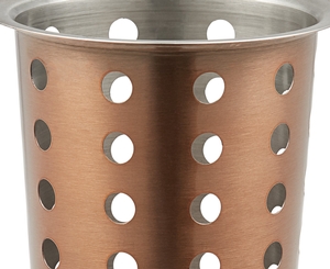 Thanks to its stainless steel construction with copper finish, this flatware cylinder is designed to stand up to frequent use where plastic flatware cylinders wouldn't last. For extra versatility, this cylinder is stackable to save you on storage space when it is not in use. This Choice perforated copper finish stainless steel flatware holder cylinder is ideal for frequent use in your high-volume operation.