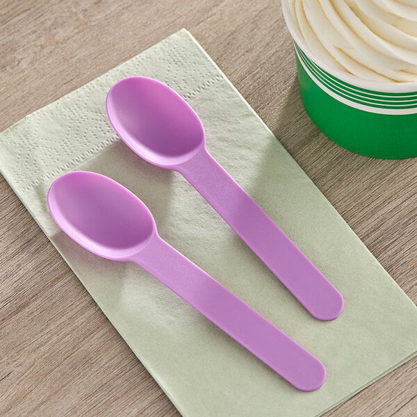 These spoons are perfectly crafted for savoring delectable frozen desserts such as frozen yogurt, soft serve, and gelato. Ideal for yogurt shops, concession stands, and fairs, guests will be thrilled with the vibrant purple color.