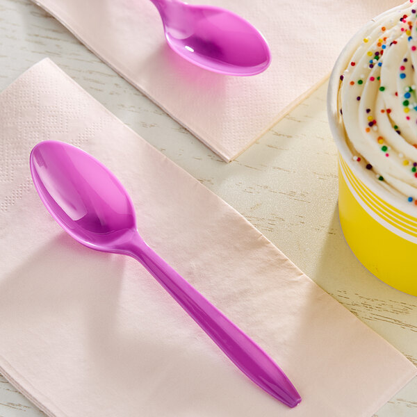 These spoons are perfectly crafted for savoring delectable frozen desserts such as hard ice cream, gelato, and frozen yogurt. Ideal for ice cream shops, concession stands, and fairs, guests will be thrilled with the vibrant purple color.