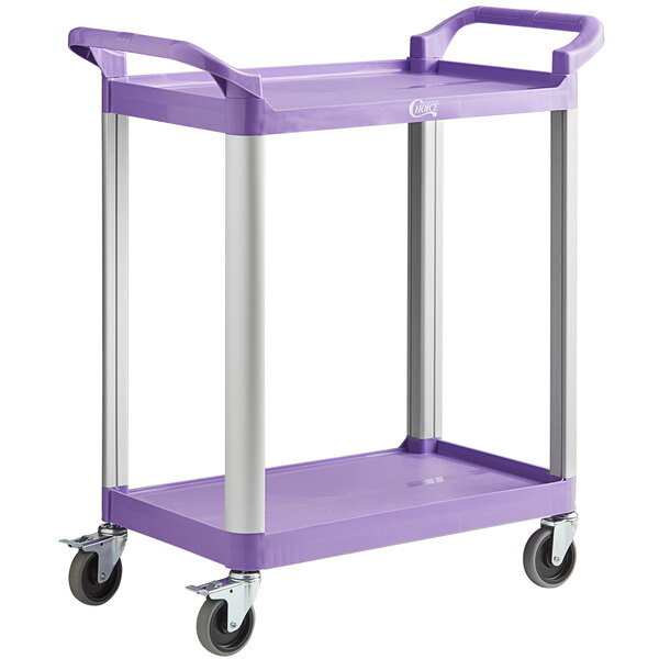 This Choice purple utility / bussing cart with two shelves is a reliable way to transport a wide array of items in your establishment.