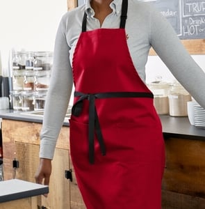 - Item #: 160bibadbwrdChoice Red Poly-Cotton Adjustable Bib Apron with 2 Pockets and Black Webbing Accents - 32" x 30"