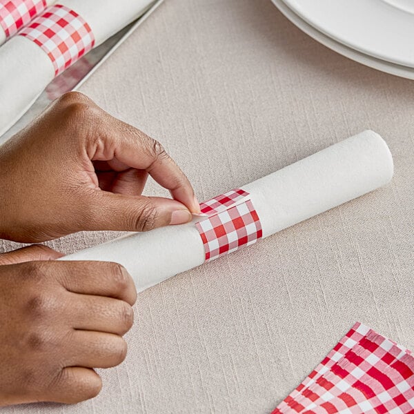 Featuring an attractive red and white gingham design, these napkin bands add a touch of charm to your dining area. Perfect for holding rolled napkins and flatware securely in place, these bands are a must-have for restaurants, cafes, and catered events. Ensure a seamless dining experience with these stylish and practical napkin bands!