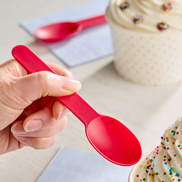 These spoons are perfectly crafted for savoring delectable frozen desserts such as frozen yogurt, soft serve, and gelato. Ideal for yogurt shops, concession stands, and fairs, guests will be thrilled with the vibrant red color.
