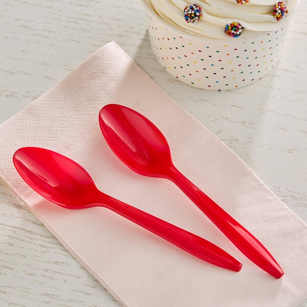 These spoons are perfectly crafted for savoring delectable frozen desserts such as hard ice cream, gelato, and frozen yogurt. Ideal for ice cream shops, concession stands, and fairs, guests will be thrilled with the vibrant red color.