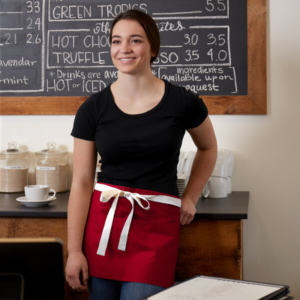This waist apron is perfect for keeping your bartender, bakery, school, hospital, or nursing home staff clean and comfortable during their shift. It features a durable fabric, convenient pockets, and an attractive natural and red color. Your bar and wait staff will look sleek and professional in this Choice apron.