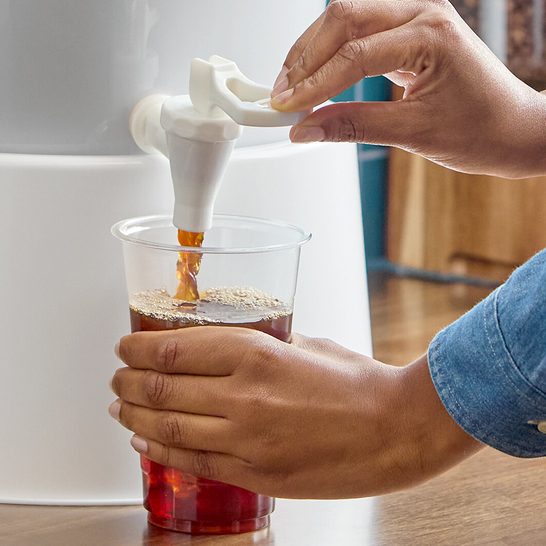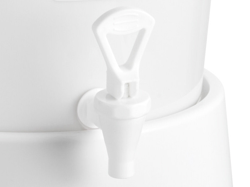 This Choice round 3 gallon white beverage dispenser with white base is the perfect balance between functionality, durability, and style.